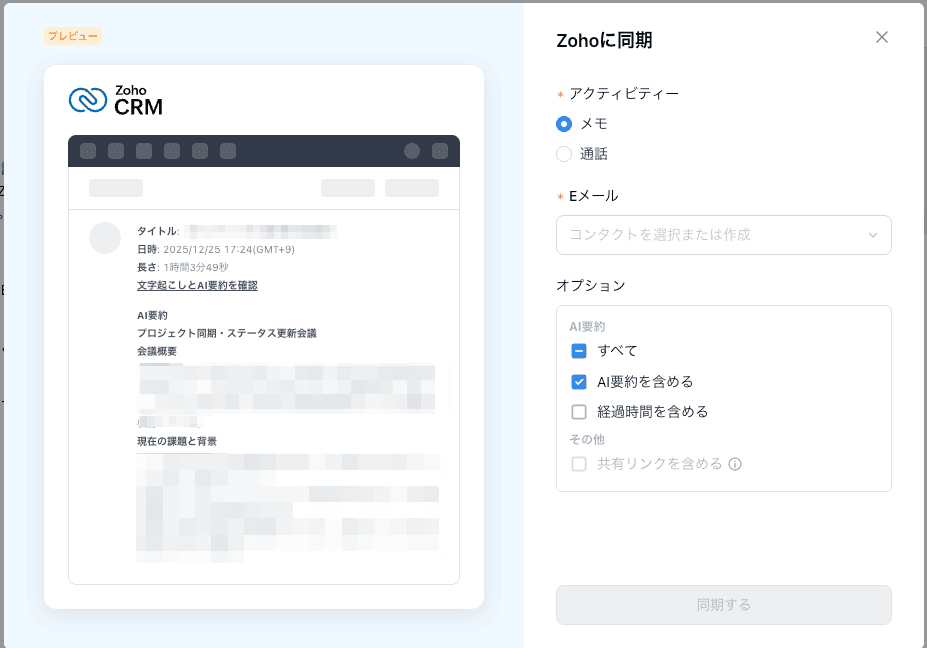 メモを選んだ場合:Zoho CRM の連絡先の「メモ」欄に文字起こし・AI 要約・関連リンクなどが表示されます。