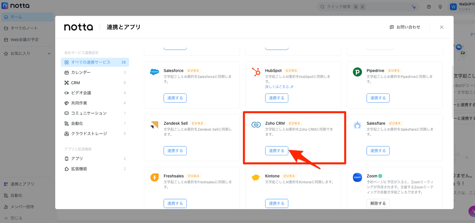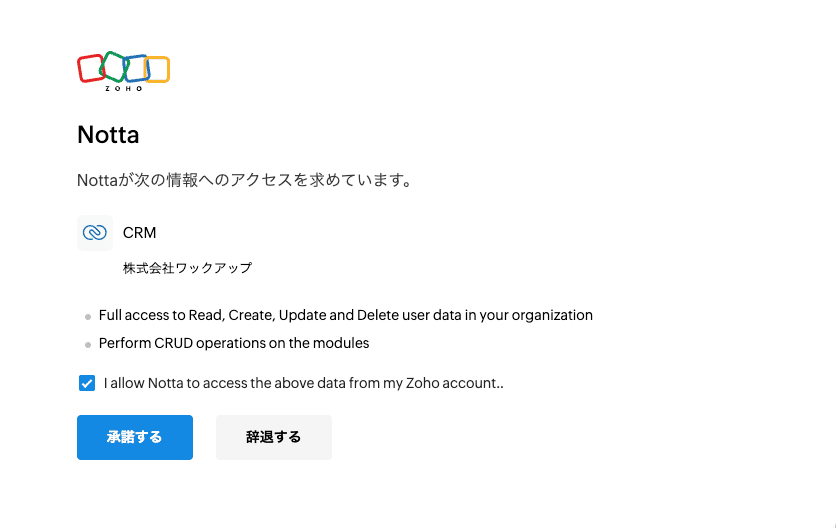 この手順で Notta と Zoho CRM の間に接続が確立されます。