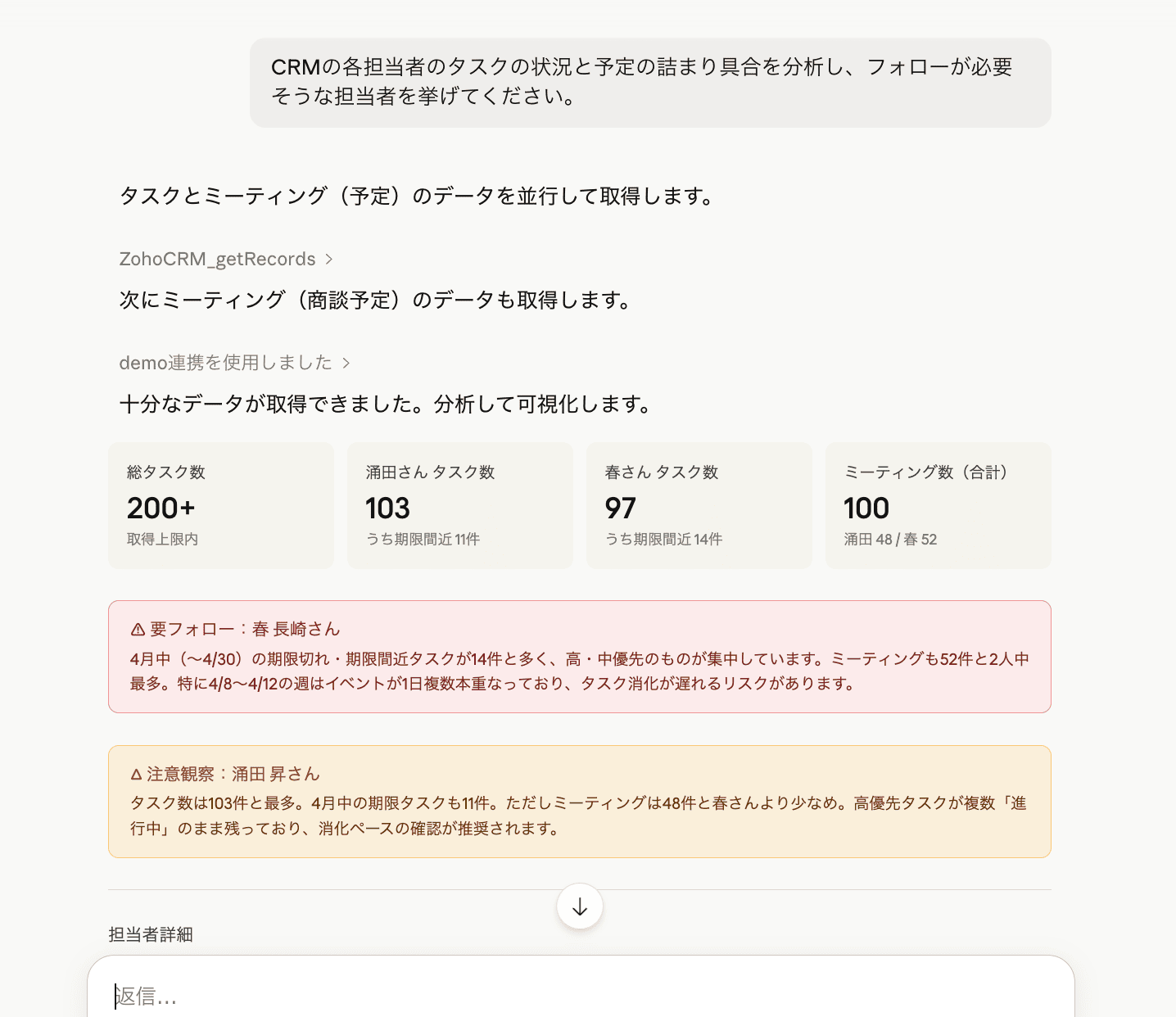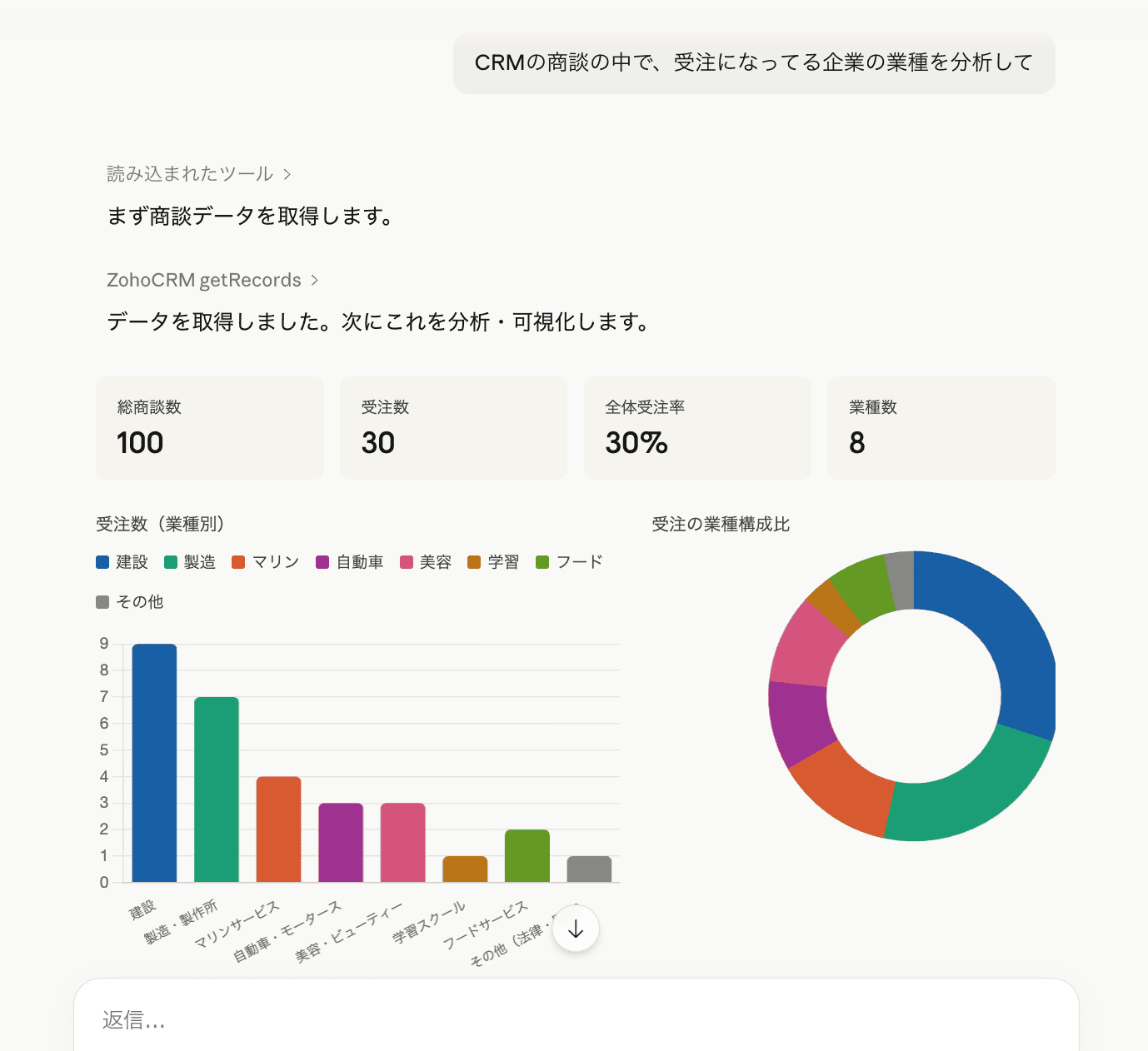 Zohoに蓄積されたデータを、画面操作ではなく、会話という形で引き出せるようにすることで、初めてデータが経営に入り込んできます。